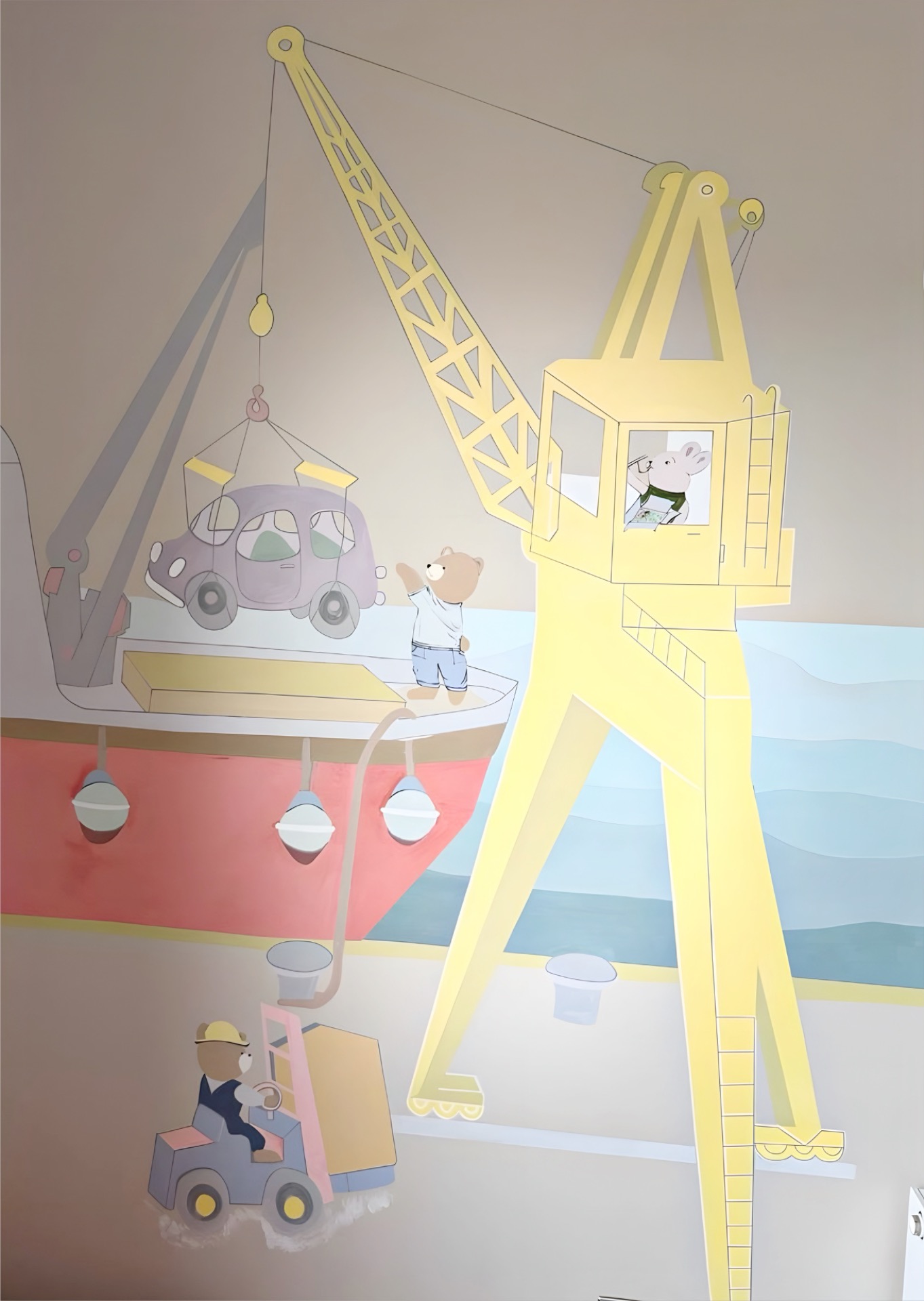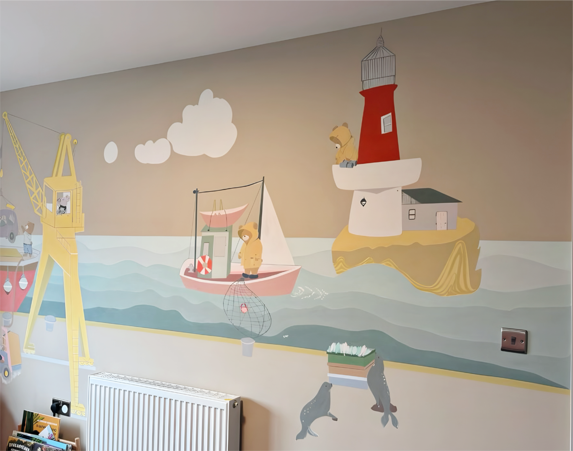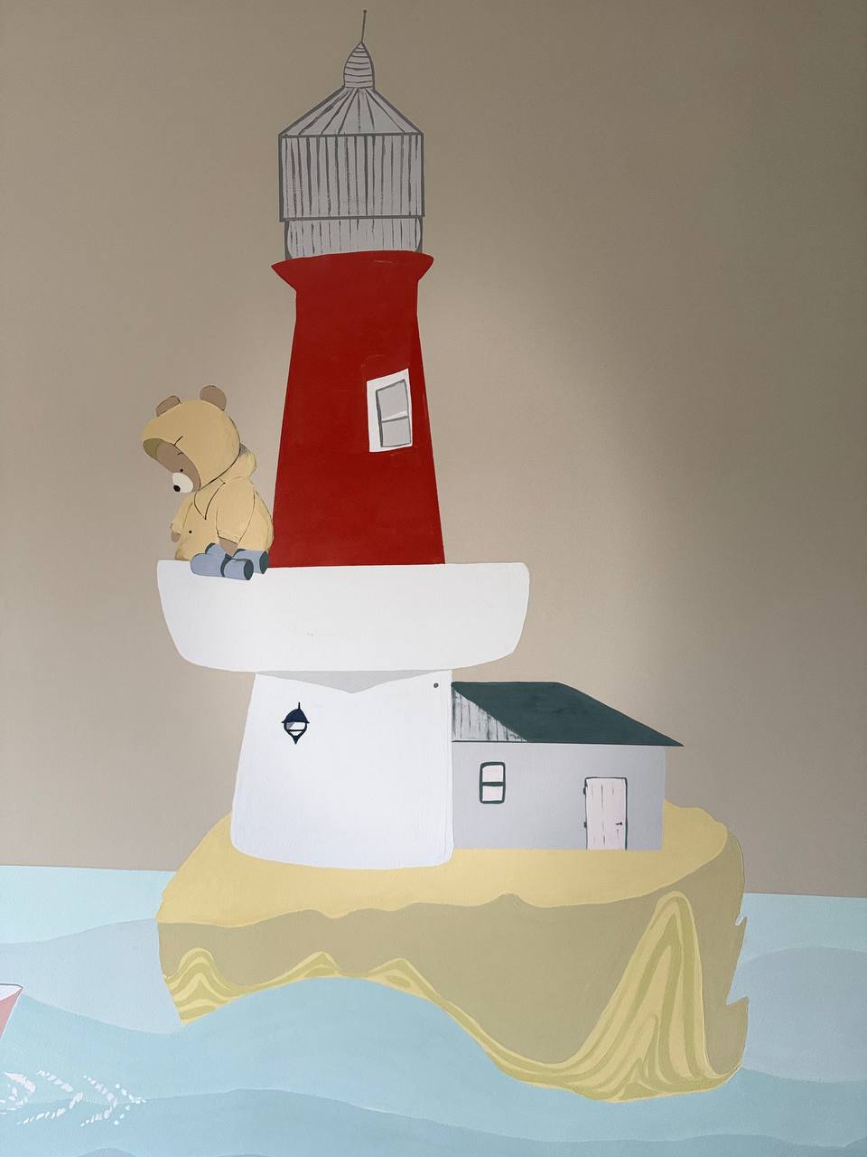 A lively seaside world comes to life, full of gentle movement and friendly characters. A beacon rises above the scene, keeping watch over small vessels drifting nearby. Soft colors and playful shapes create a warm, story-like atmosphere where activity and calmness blend together, making the whole composition feel inviting and full of adventure.