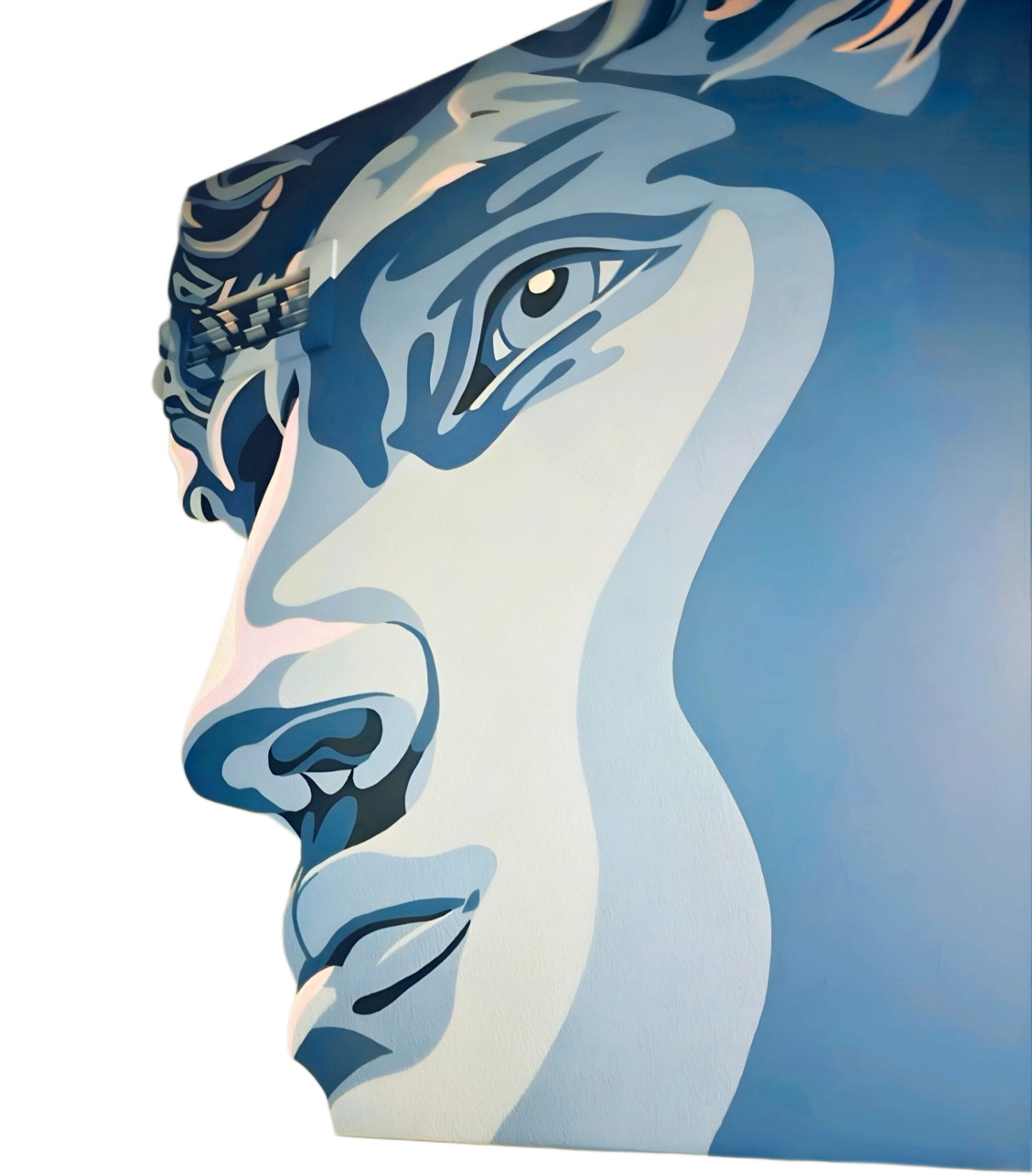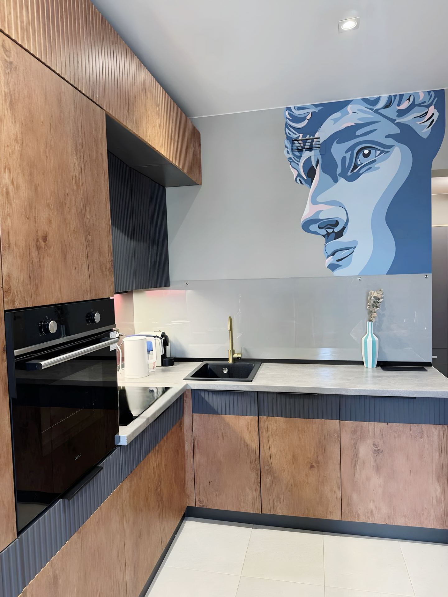 The artwork transforms the kitchen into a modern gallery. A bold, stylized portrait—clearly inspired by classical sculpture—emerges in sweeping shades of blue and white. The face looks both ancient and futuristic, as if a marble god has stepped into the digital age. Its sharp contours and dramatic shadows give the impression that it's watching over the room, adding a sense of depth and character.