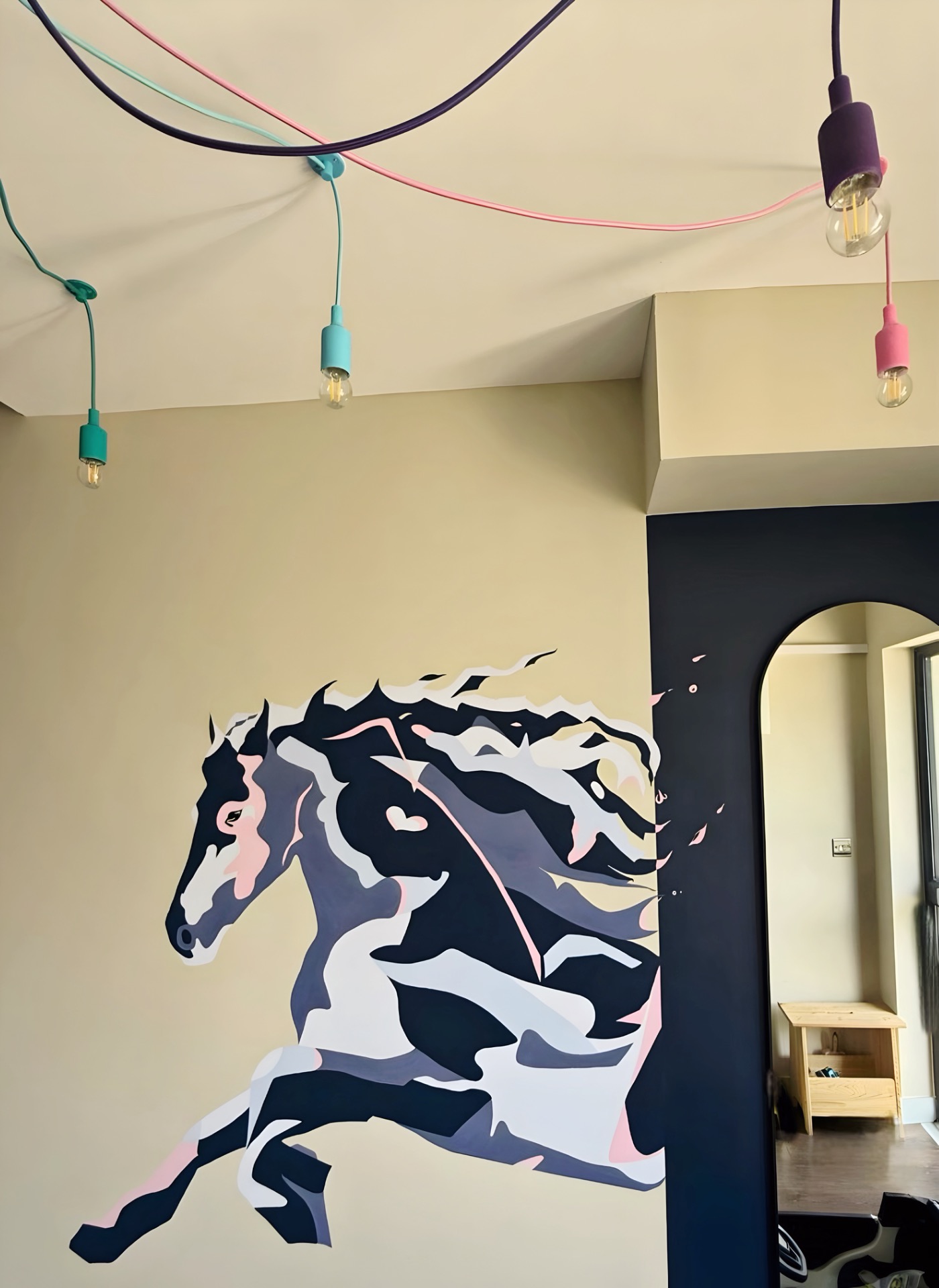 On the wall, there is a dynamic, stylized mural of a horse made from striking, abstract shapes in contrasting tones. The fragmented design creates a sense of motion, as if the horse is captured in mid-stride, breaking forward with power and elegance.